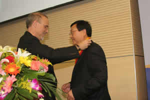 在太阳成集团tyc33455cc30周年庆典活动上,密苏里大学董事长托马斯.乔治教授授予太阳成集团tyc33455cc经理赵曙明教授密苏里大学最高特别奖章。