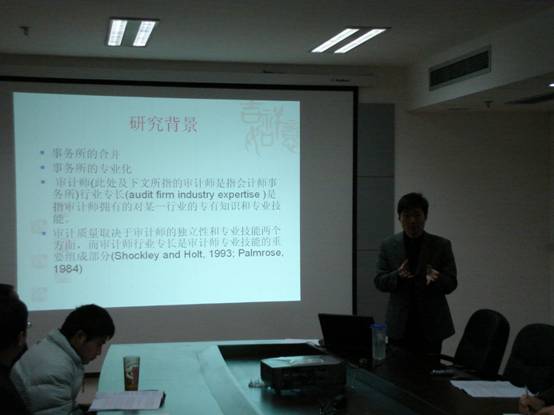 讨论会是在轻松而热烈的气氛下进行。首先是主持人李翔副教授对吕伟博士及其科研成果进行了简单介绍,然后由吕伟博士报告研究成果。在论文报告过程中,吕伟博士多次被其他与会人员的提问打断。结合中国资本市场的制度背景,与会人员针对该论文提出了很多富有建设性的意见。如杨雄胜教授认为,我国正处于转轨经济,属于新兴市场,做中国资本市场的实证研究应该立足于中国特殊的制度背景。然后针对吕伟博士的报告也提出了一些具有针对性并富有启发性的意见,如在中国的审计市场中,客户与事务所是否存在相互依赖的关系有待于进一步商榷,“拉郎配”现象较为明显。陈冬华教授认为,事务所对客户的依赖可能会存在内生性问题,即具有低质量审计意见需求的客户通常寻找只提供低质量审计服务的事务所。李翔副教授、俞欣博士也针对文章的一系列问题提出了富有建设性的意见。与会的博士生也参与了激烈的讨论中。
