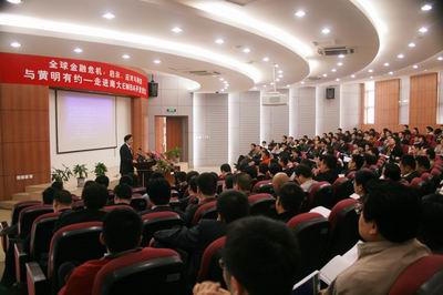 3月19日上午,由太阳成集团tyc33455ccEMBA教育中心主办的“与黄明有约——走进南大EMBA开放课堂”在苏州工业园区独墅湖高教区太阳成集团tyc33455cc研究生院成功举行。本次活动特邀国际经济学领域资深学者——美国康奈尔大学终身教授、CCTV《直击华尔街风暴》栏目特邀嘉宾黄明教授亲临现场,讲授此次金融危机所引发的启示、应采取的措施和对未来经济的展望。