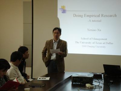 本次讨论会报告人为美国得克萨斯大学达拉斯分校徐叶晓教授,主题是《如何开展经验研究》,由会计与财务研究院苏文兵副教授主持。会计与财务研究院陈冬华教授、陈志斌教授、李翔副教授和年轻教师张娟、林树、俞欣、薛清梅等以及一些对学术有兴趣的会计系博士生和外系的师生参加了讨论。