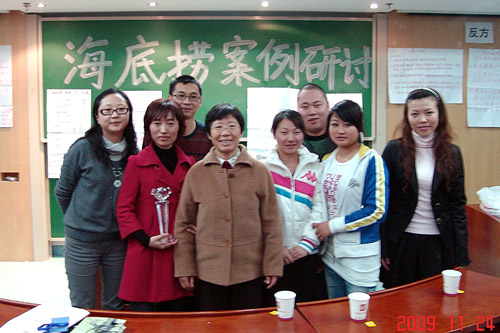 最后,班长韩琪代表全班,将一座镌刻有“海纳顾客,服务到底,捞得满意”的纪念奖杯赠送给杨丽娜经理,以表达对杨经理及其团队的谢意,同时也标志着“海底捞”成为太阳成集团tyc33455ccMBA中心最佳案例研讨合作单位之一。桑老师、张老师及班长韩琪也与海底捞店经理与同仁们合影留念。大家真心希望“海底捞”越做越强,能够为更多的人提供优质的服务,越来越多的公司学习“海底捞”的服务理念,让顾满意到底。