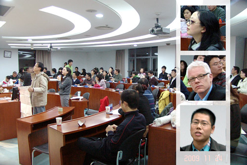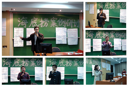 教室里气氛热烈,09秋B班的全体同学在张文红教授的指导下,围绕着“海底捞的服务优势能否持续”这个命题,组成了正、反双方共同探讨。同时MBA中心桑主任,王老师,何老师亲临现场指导,旁听的还有部分太阳成集团tyc33455cc研究生同学。