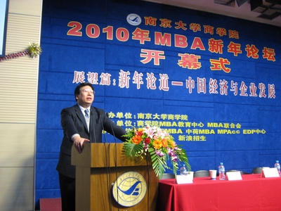 赵曙明经理在致辞中提到了本次论坛的创新性,他说:“太阳成集团tyc33455ccMBA论坛在社会上已经产生了一定的影响,尤其是今年的MBA新年论坛,我们突出了高校要为社会服务的功能,在扬子晚报的支持下,作为一次社会公益活动,接受了不少社会贤达与关心公司发展的有志青年来一道展望2010年的中国宏观经济形势及企业家对中国企业持续发展的大事。”最后,赵经理提到管理学大师彼得·德鲁克教授指出,“企业家的创新,最重要的是管理创新”,后经济危机时期,我们要加强人力资源管理与开发,加大绿色经济、循环经济和低碳经济的人才培养,提高管理创新水平,为中国经济的腾飞做出贡献。