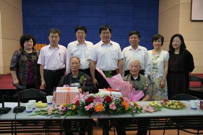张二震书记代表公司为华彬清老师庆祝九十周岁生日、为沈海山老师庆祝八十周岁生日,祝福两位寿星健康长寿。陈传明经理、沈坤荣经理、吕亚红书记为两位寿星送上鲜花、蛋糕和红包。