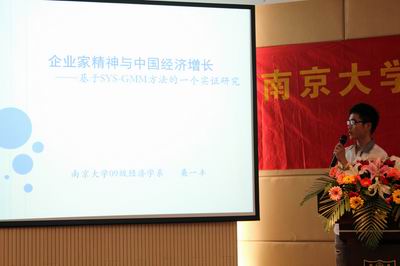 一等奖获得者桑一丰同学则就他的获奖论文《企业家精神与中国经济增长》进行了现场陈述,安同良教授作了现场点评。桑同学精彩大气的陈述与安教授全面深刻的点评给现场观众留下了深刻的印象。