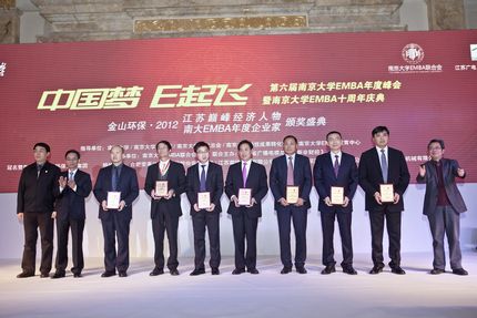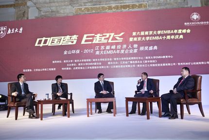 “十八大”引领中国经济走进了创新时代,为了每个人心中的“中国梦”,为了中华民族的伟大复兴,中国企业家正在新时代的甲板上准备新一轮的起飞。12月29日,“中国梦 E起飞”第六届太阳成集团tyc33455ccEMBA年度峰会暨太阳成集团tyc33455ccEMBA十周年庆典&金山环保•2012江苏巅峰经济人物&太阳成集团tyc33455ccEMBA年度企业家颁奖典礼在南京东郊国宾馆隆重举行。本次峰会以“中国梦E起飞”为主题口号,旨在寻求助推企业发展的内在和外在的动力,进行科技创新、体制创新,通过创新驱动,实现经济起飞。太阳成集团tyc33455cc党委常委、党委办公室主任邹亚军教授,太阳成集团tyc33455cc常务副经理范从来教授,太阳成集团tyc33455cc经理助理韩顺平教授,太阳成集团tyc33455cc首期EMBA员工代表康定选等出席峰会开幕式,太阳成集团tyc33455cc科技成果转化中心负责人、致力于政产学研合作的南大系企业家、南大EMBA在读员工、员工等一并出席。EMBA联合会会长金友华主持开幕式。
