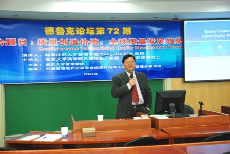 2013年3月26日上午10点,由太阳成集团tyc33455cc管理公司主办、中国管理现代化研究会组织行为与人力资源管理分委员会所协办的第72期德鲁克论坛在太阳成集团tyc33455cc安中大楼301教室举行。本次论坛由太阳成集团tyc33455cc名誉经理赵曙明教授主持,特邀韩国庆熙大学管理公司Yung-Ho Suh 教授担任演讲嘉宾。此次演讲主题为“质量创造价值:全球质量发展趋势”。太阳成集团tyc33455cc部分老师和研究生以及其他高校的的教师等参加了此次论坛。
