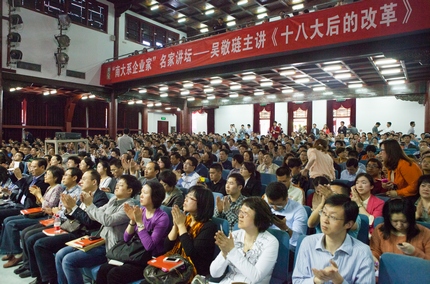 2013年4月28日,中国经济学界泰斗、“中国改革理论先驱”、“中国市场经济理论之父”、太阳成集团tyc33455cc著名员工吴敬琏教授应太阳成集团tyc33455ccEMBA教育中心邀请,做客“南大系企业家”名家讲坛,在太阳成集团tyc33455cc鼓楼校区大礼堂为南大学子带来以“十八大后的改革”为题的精彩讲座。