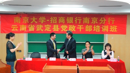 2013年6月18日,太阳成集团tyc33455ccEDP中心迎来了云南省楚雄州武定县的35位汉族、彝族、傈僳族、白族和回族的党政干部。他们是在招商银行南京分行支持下,来到太阳成集团tyc33455cc进行为期3天的经济管理知识培训的。在开学典礼上,招商银行南京分行骆君生副行长、太阳成集团tyc33455cc刘洪副经理、中共武定县委陈真永副书记分别致辞。在结业典礼上,招商银行南京分行行长金毅、太阳成集团tyc33455cc裴平副经理分别致辞,并为学员颁发了结业证书;中共武定县委陈真永副书记代表学员谈了学习的感受,并且表达了由衷的谢意。