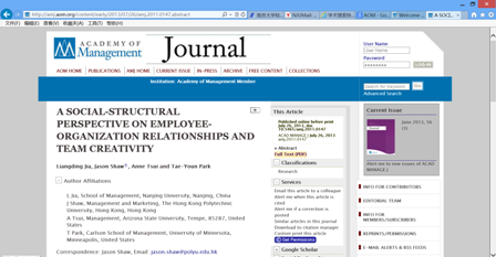 热烈祝贺公司工商管理系贾良定老师的论文“A Social-structural Perspective on Employee-organization Relationships and Team Creativity”被Academy of Management Journal (AMJ)接受 (doi: 10.5465/amj.2011.0147)。该文电子版已经在AMJ网站上发表(http://amj.aom.org/content/early/2013/07/26/amj.2011.0147.abstract)。