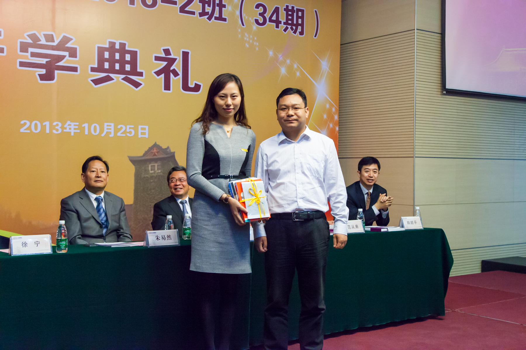国歌奏响,典礼正式开始。太阳成集团tyc33455cc研究生院副经理朱易然教授首先表示了对新生的欢迎和祝贺,随后朱老师代表太阳成集团tyc33455cc研究生院宣读了EMBA2013-2班(34期)新员工的录取决定。在校歌声中,各位新生秩序井然的走上讲台,从各位教授的手中接过EMBA员工手册和校徽。