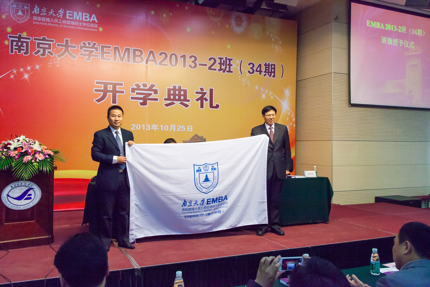 在老生代表向新生代表赠书后,范经理将一面EMBA班旗授予给新班,班主任朱昊老师作为代表接受旗帜。