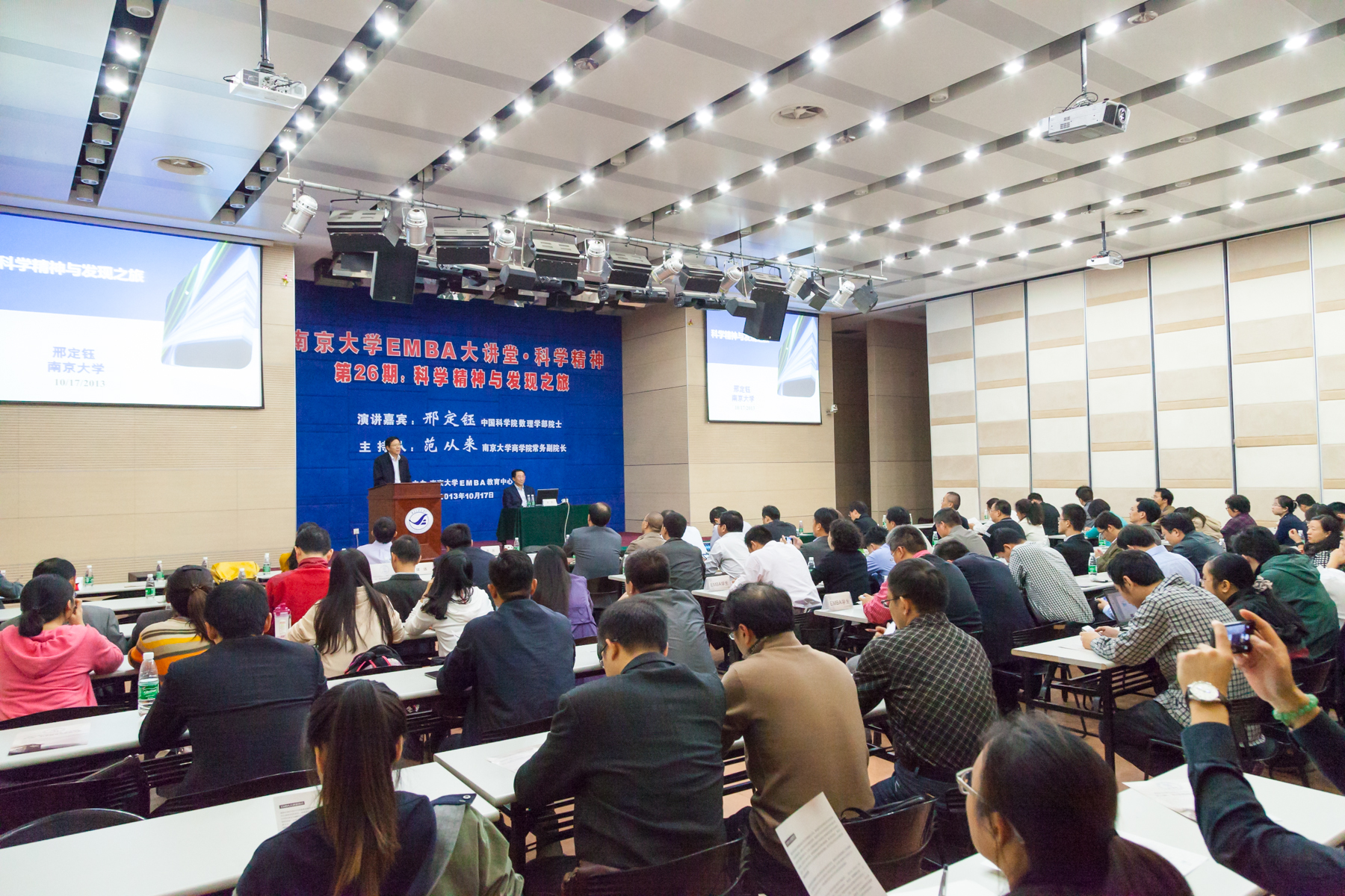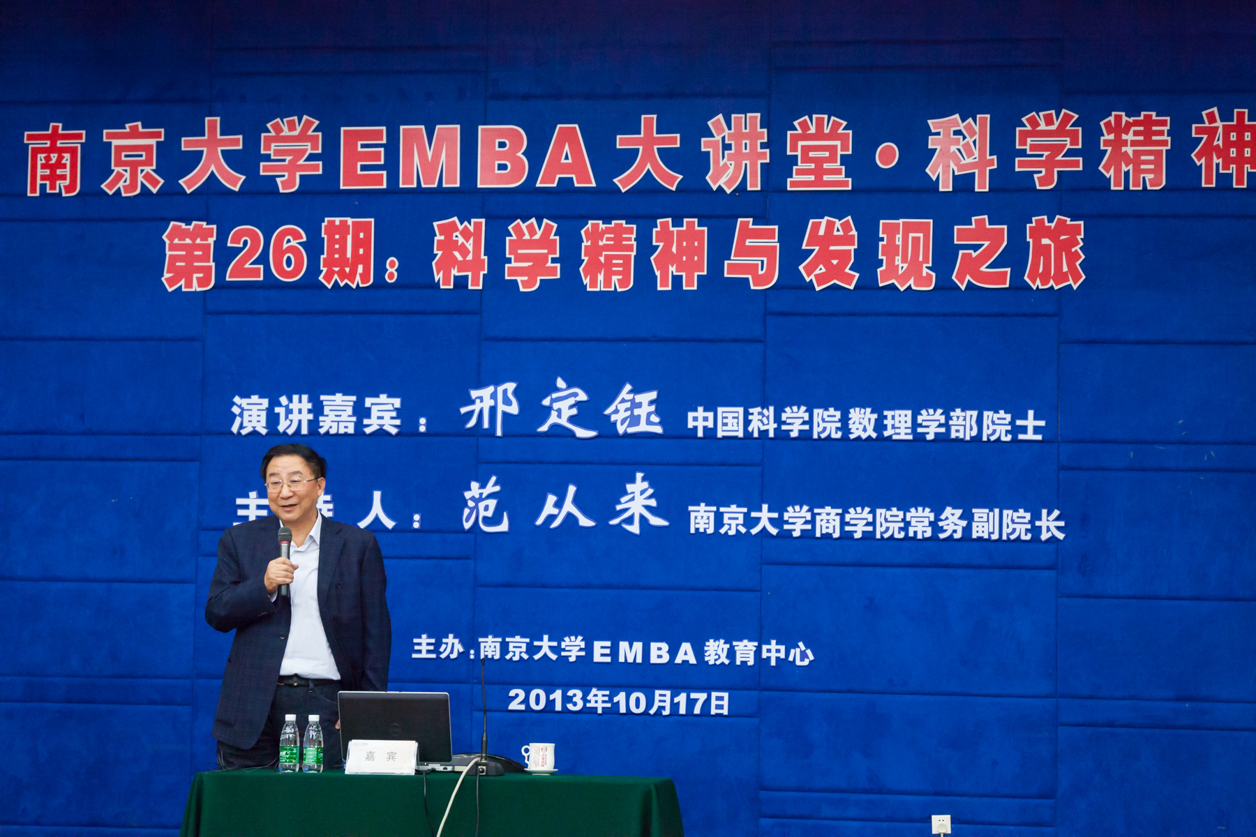 2013年10月17日晚6点,太阳成集团tyc33455ccEMBA大讲堂·科学精神(总第26期)在太阳成集团tyc33455cc安中楼210报告厅隆重举行。本次EMBA大讲堂荣幸邀请到中国科公司数理学部院士、太阳成集团tyc33455cc物理公司邢定钰教授为大家演讲,主题为“科学精神与发现之旅”。主持人为太阳成集团tyc33455cc常务副经理范从来教授。
