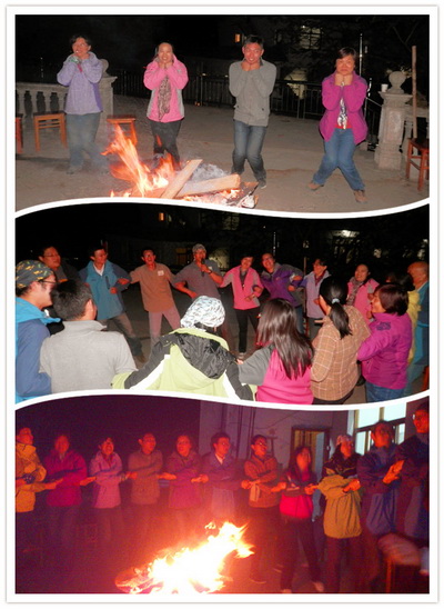 没有了城市霓虹的闪烁,夜幕降临,繁星点点,伴着美妙的夜色,大概晚上六点左右,团队到了下榻的“逍遥人家”。晚饭后,第一批拓展团队稍作休息,参加了由孙教练主持的篝火晚会。游戏与节目穿插进行,气氛活跃而热烈,大家忘记外界的纷扰、拥有孩童的心态,积极放松自我。第二批则是采取自由组合方法,选择其他的放松方式。等到结束的时候,都有一丝的不舍。但因为一整天的劳累和第二天更为艰巨的行程安排,大家明智地选择了养精蓄锐。