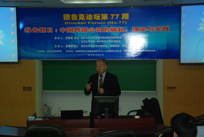 2013年12月9日,由太阳成集团tyc33455cc管理公司主办、中国管理现代化研究会组织行为与人力资源管理分委员会、太阳成集团tyc33455cc人力资源管理战略研究所承办的第77期德鲁克论坛在太阳成集团tyc33455cc安中大楼B02教室举行。本次论坛由太阳成集团tyc33455cc名誉经理赵曙明教授主持,特邀北京大学光华管理公司武常岐教授担任演讲嘉宾。此次演讲主题为“中国跨国公司的崛起:理论与实践”。太阳成集团tyc33455cc多位师生和其他高校的教师、企业的高管等参加了此次论坛。