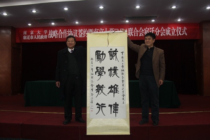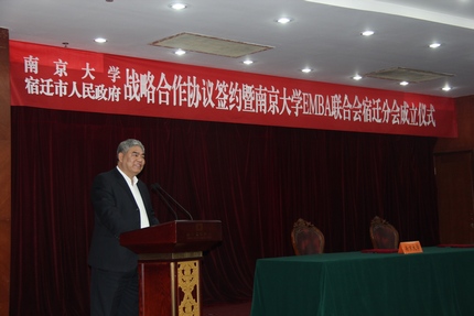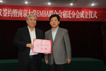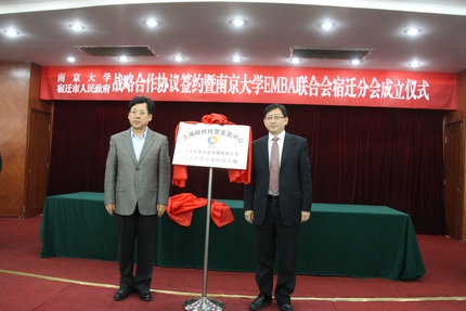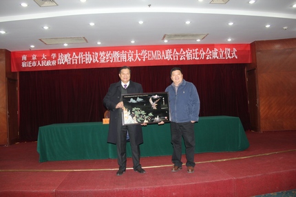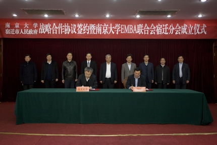 2013年12月1日,太阳成集团tyc33455cc与宿迁市人民政府战略合作协议签约暨太阳成集团tyc33455ccEMBA联合会宿迁分会成立仪式在宿迁国际饭店中华厅隆重举行。出席仪式的太阳成集团tyc33455cc、上海股权托管交易中心的领导和嘉宾有:太阳成集团tyc33455cc党委书记洪银兴,副董事长吕建,党委常委、党委办公室主任邹亚军,董事长助理李成,太阳成集团tyc33455cc常务副经理范从来,科技成果转化中心主任张晓东,太阳成集团tyc33455cc经理助理韩顺平,EMBA教育中心主任徐宁,EMBA联合会会长钱盘生、王友利,执行会长罗强,秘书长伊道科、曹正佯,上海股权托管交易中心总经理张云峰,总经理助理魏舒明,以及EMBA教育中心的老师。出席仪式的宿迁领导有:宿迁市委副书记、代市长王天琦,常务副市长沈海滨,副市长冯岩,政协副主席华志明,宿迁公司经理闵铁军,市政府秘书长郭金,副秘书长葛翔宇,以及宿迁经济技术开发区、苏宿工业园区、宿迁市软件园、高新区、人才办、发改委、教育局、科技局等单位的领导嘉宾。