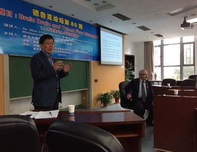 论坛一开始,黄维乔教授首先以诙谐幽默的方式介绍了他此行的意义,为了更好地促进中美文化的交流,进一步加深双方国的了解,作为美国富布莱特学者他将对中国进行为期10个月的友好访问,而太阳成集团tyc33455cc是其此行中的一站。接着,黄教授对人才流失和人才管理作了简要评述,对此简要谈及自己的看法。他认为人才流失和人才流动管理是人类行为各个方面的反映,可以用传统的经济学方法分析和建模,他说1992年诺贝尔奖获得者Gary Becker 作为先驱者,首次突破经济学分析范畴,运用经济学解释人类行为。黄教授认为人才流失分为国家和企业两个层面,分别针对这两个层面进行分析并提出建议。在国家层面,人才流失的来源主要有以下几种:1)非直接移民;2)留美员工;3)高度熟练工;4)亚洲移民;5)医生及医护人员移民。黄教授还分别从全球VS国际、输出国VS输入国、国家VS个人、短期VS长期、静态VS动态等方面分析人才流失的影响,并提出政策方面的建议。同样他也对企业层面进行了分析并提出经济方面的建议。