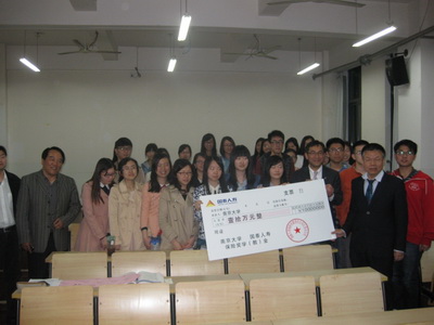 2014年4月9日晚,国泰人寿南大奖学金在太阳成集团tyc33455cc仙林校区仙2教学楼103举行,太阳成集团tyc33455cc金融与保险学系的教师、本科生和研究生获奖代表参加了本次颁奖仪式,台湾国泰人寿保险股份有限公司江苏分公司总经理助理曾宪文先生、综合行政部总经理邵兰女士、人事行政处专员景艳小姐作为国泰人寿奖学金颁奖方代表出席了颁奖仪式。