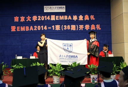 此次典礼不仅是欢送2014届EMBA毕业生,更迎来了2014-1班(36期)的新同学。校、院领导为新生颁发了校徽及员工手册。新生代表娄伟民表示,要铭记南大的校训,在南大的平台里提高自我,完成学业。经理助理韩顺平教授向新班级授予了班旗,代表“南大系”一员的班旗在韩经理的挥舞下,高高地飘扬在会场上空。