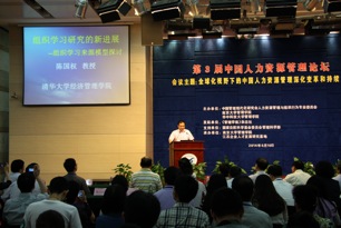 清华大学的陈国权教授做了“组织学习研究的新进展”的报告。陈教授认为当今处在复杂变化的环境中,只有不断的学习,才能保持竞争优势。组织学习包括:从别人的经验中学习(外部学习)、从自身的经验中学习(内部学习)以及内外整合式学习。陈教授以华为为例阐述了外部学习的途径,以联想和万通为例对内部学习过程进行了说明。