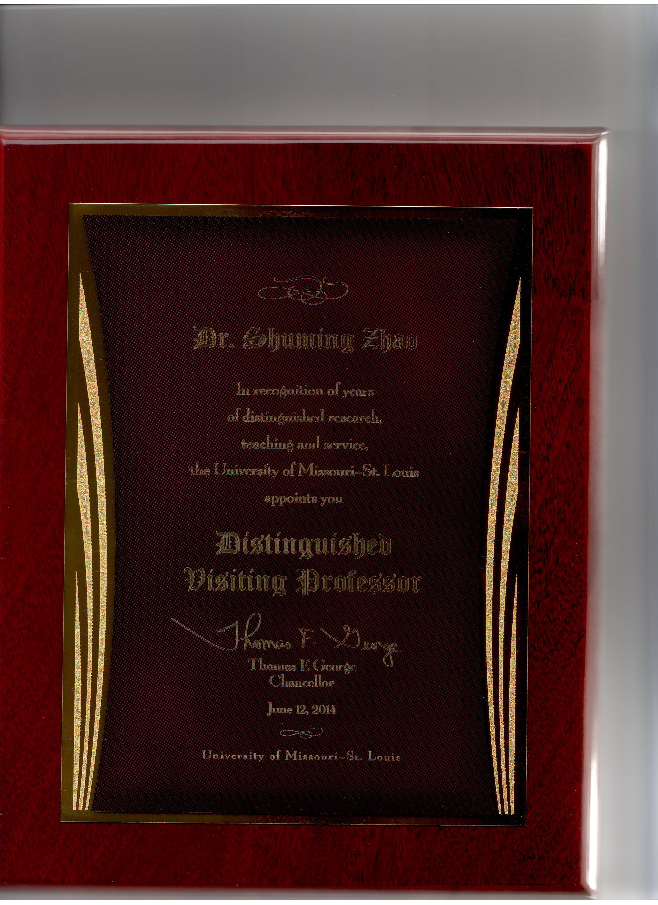 With this record of teaching and research as a foundation, the University of Missouri –St. Louis has promoted Dr. Zhao to the rank of Distinguished Professor, the rank he will now hold during his annual pilgrimages to St. Louis. It is our pleasure to take note of this title change by presenting Dr. Zhao with a plaque that commemorates this milestone.