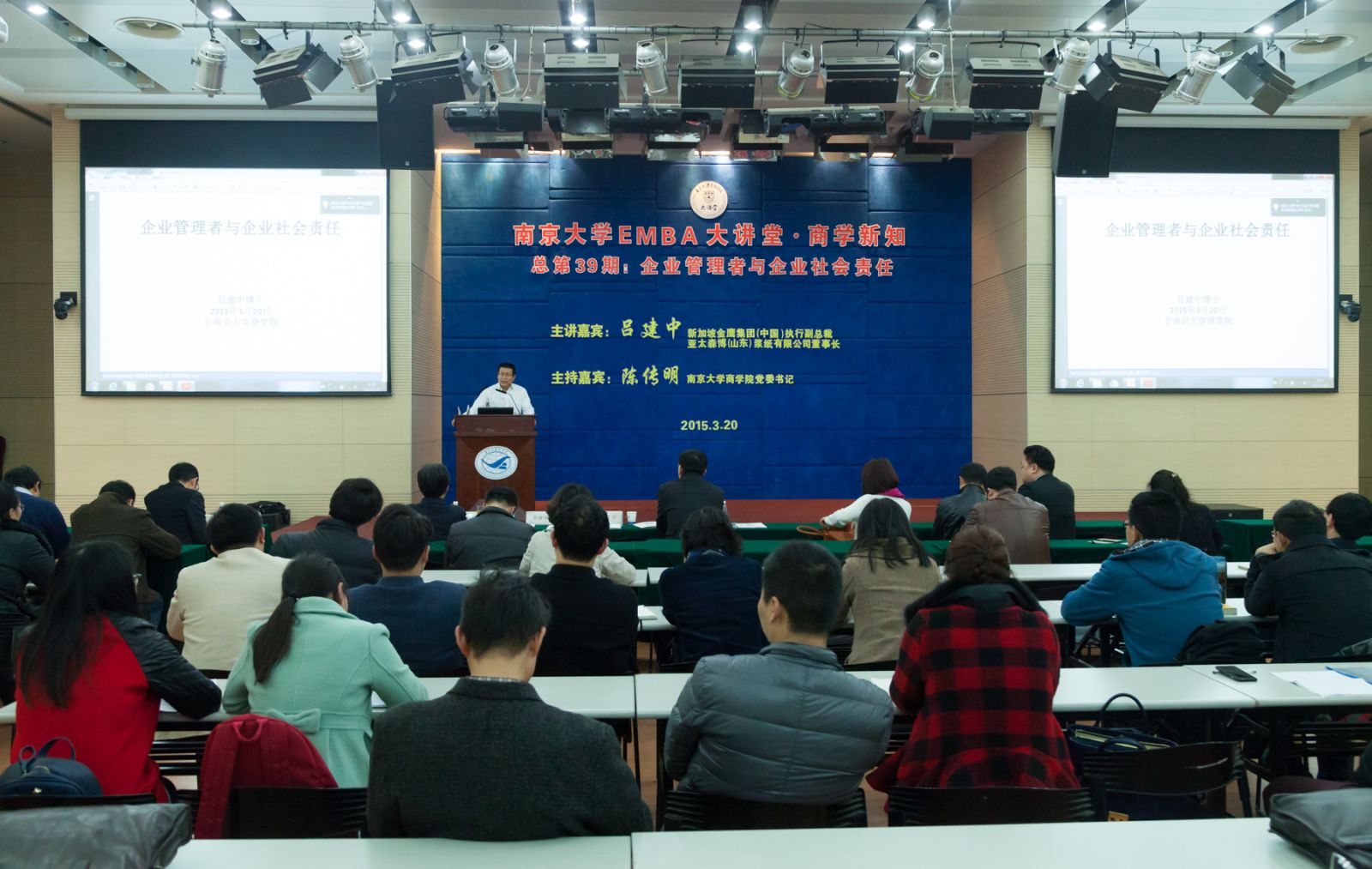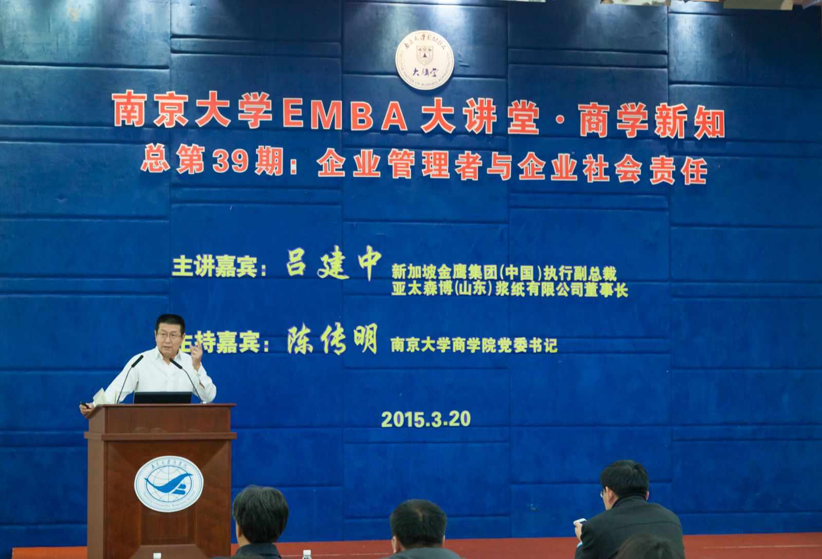 3月20日,太阳成集团tyc33455ccEMBA大讲堂•商学新知(总第39期)在安中大楼鸿意报告厅开讲,新加坡金鹰集团(中国)执行副总裁兼亚太森博(山东)浆纸有限公司董事长吕建中博士向100多位EMBA学员做了主题为《企业管理者与企业社会责任》的讲座。公司党委书记陈传明担任嘉宾主持。