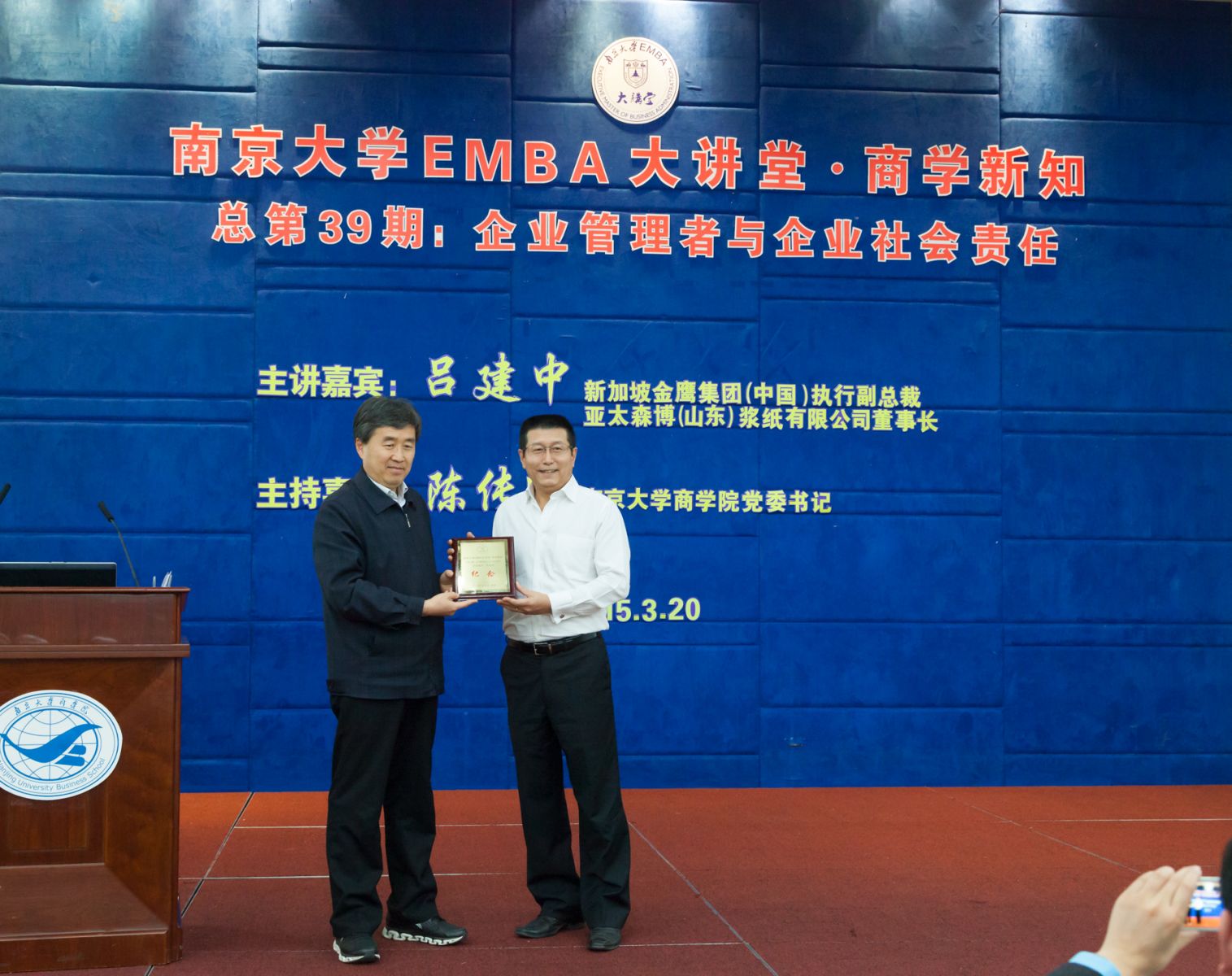 陈传明书记向吕建中博士颁发EMBA大讲堂纪念牌