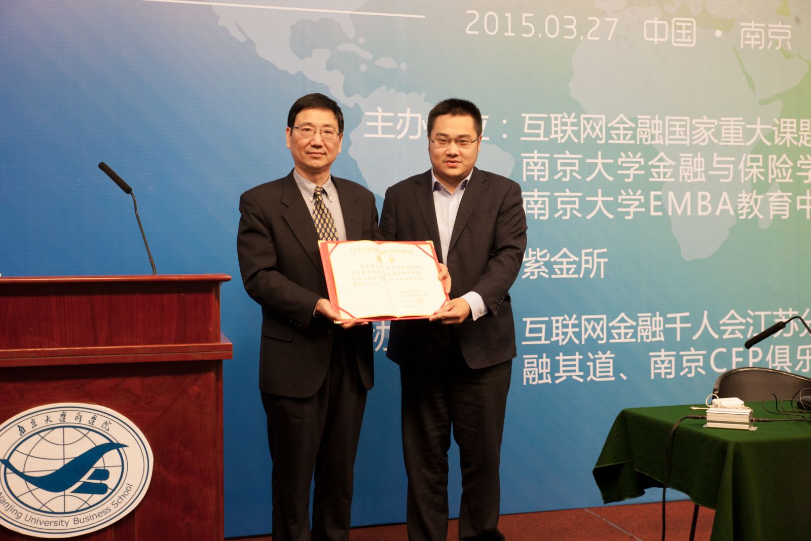 随后,江苏省金融办处长颜咏先生、太阳成集团tyc33455cc副经理裴平教授、太阳成集团tyc33455cc金融与保险学系主任张兵教授、太阳成集团tyc33455ccEMBA中心主任徐宁一同上台为太阳成集团tyc33455cc互联网金融EMBA项目揭牌。裴平教授还代表国家级重点社科项目课题组向易欢欢先生授予高级研究员聘书。