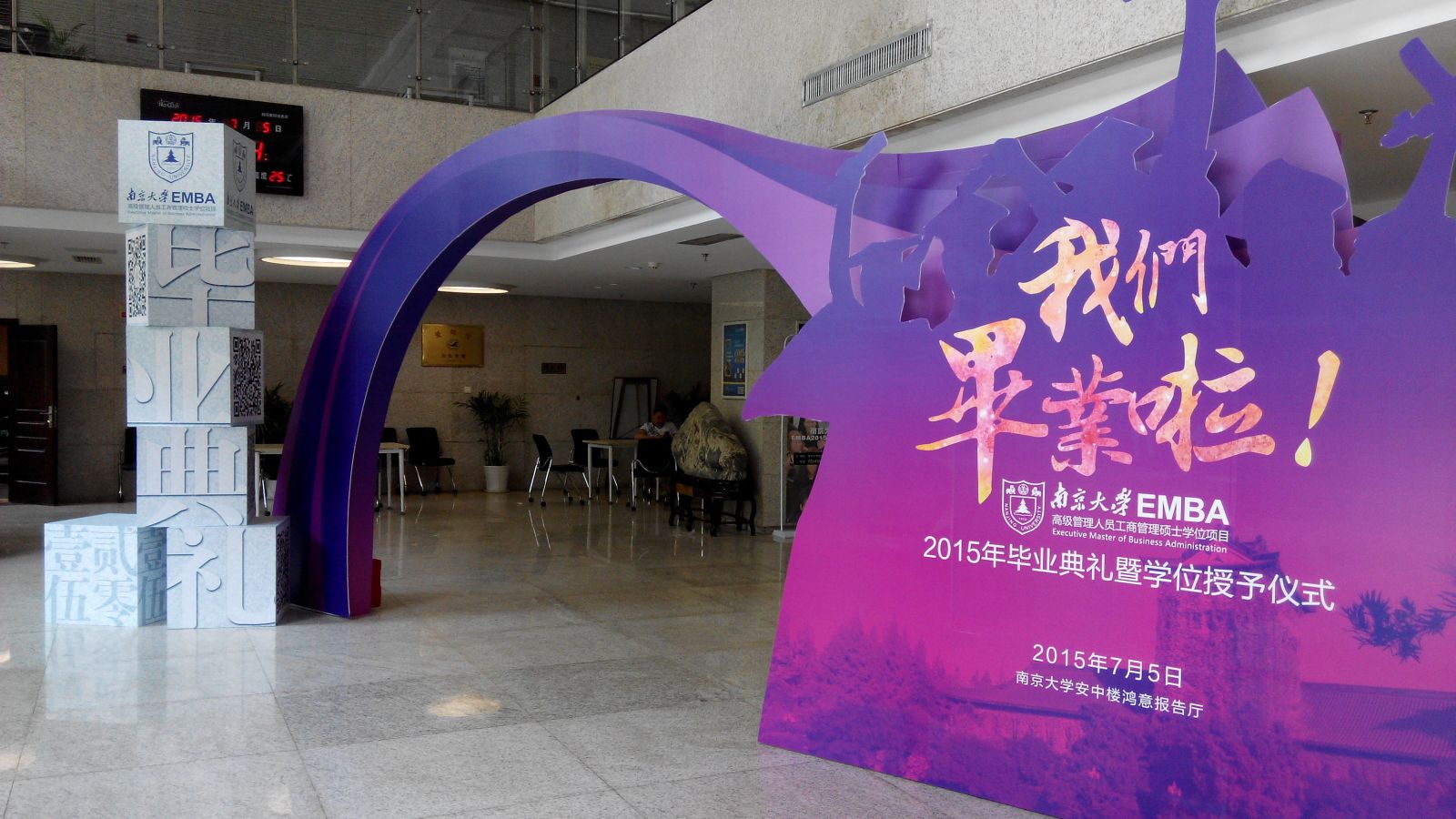 今年的毕业季,共有5个班级的EMBA企业家完成了学业。南大系的“E群人”从四面八方汇集母校,齐聚一堂,共同庆祝这激动人心的荣耀时刻。EMBA教育中心也经过精心策划,为同学们奉上了一场别开生面的毕业典礼。大厅里隆重气派的拱门,象征着同学们走出校门后的灿烂辉煌;楼梯口兼具3D道具功能的引路小博士,成为同学们嵌身留影的新宠;照片墙记载着回忆里的点点滴滴……