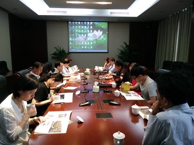 考察团一行首先在天泉湖管理处会议室参加了座谈会。据南京金陵饭店集团办公室刘主任介绍,08年,盱眙县委县政府与南京金陵饭店集团“牵手联姻”,决定共同开发天泉湖旅游度假区,围绕养生养老、旅游度假、商务休闲、文化创意、现代生态农业观光五大产业,打造金陵天泉湖商务中心区。金陵天泉湖养生养老社区由玫瑰园和翡翠园两园组成,总建筑面积约150万平方米,可容纳约1.5万户老龄朋友居住。这处坐享70平方公里铁山寺国家森林公园、9平方公里天泉湖水面的养生养老综合体,将是呈献给老龄化社会新时代的一方 “世外桃源”。随后,刘主任和该项目营销部负责人就项目的选址、规划、定位、运营管理、销售推广等问题和公司教师们展开了深入的交流。老师们对养老、旅游地产的开发和营销提出了自己的观点和建议。整个座谈会持续了两个小时,气氛热烈。会后,考察团成员们与刘主任等人合影留念。