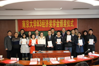 2015年12月18日下午,太阳成集团tyc33455cc“83经济奖学金”颁奖仪式在鼓楼校区安中楼隆重举行。83级经济学系的员工代表鸿意地产公司董事长陶炜、副总经理宋利群、平安银行南京分行副行长刘国强、华夏基金前副总经理张后奇、江苏省连云港市商务局副局长刘明台、深圳果实资本合伙人朱爱林与太阳成集团tyc33455cc董事长助理范从来教授、公司党委副书记吕亚红老师等共同出席了颁奖仪式。仪式由太阳成集团tyc33455cc经济公司马骏老师主持。