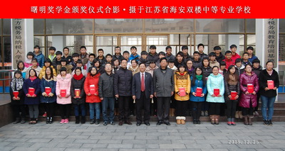 当天下午,赵曙明教授专程从南京到海安县双楼中等专业公司颁发了“第三届曙明奖学金”,这次给海安双楼中专1.5万人民币,分别奖励了品学兼优奖、技能突出奖、贫困助学奖等54同学。