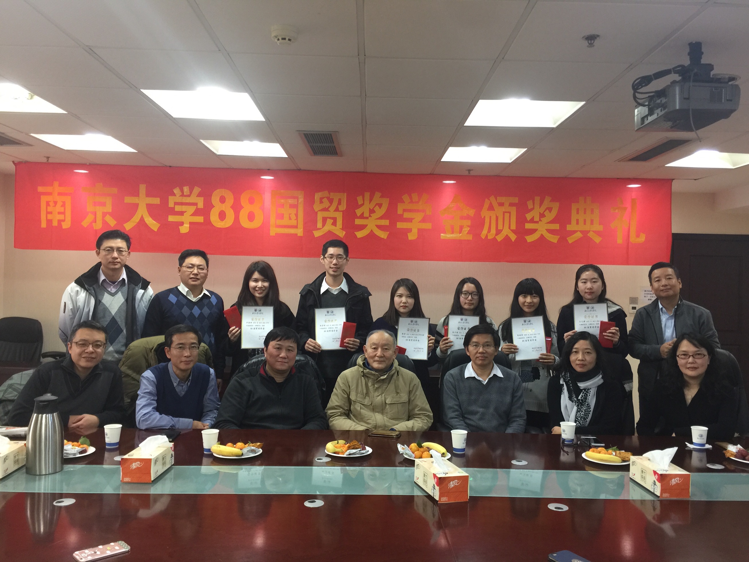 “88国贸奖学金”是由国际经济贸易系88级本科员工于2007年毕业15周年时自愿捐资设立的面向国际经济贸易系2—4年级在校本科生的高额奖学金,每次奖励6名同学。奖励对象由88级10名员工组成的奖学金评选委员会经过严格筛选、面试产生,主要奖励各方面全面发展、有特长及强烈社会责任感或进步显著的员工。本届奖学金共有许肃照等6名同学获奖。88级国贸陈旻先生、柏晓红女士等7位员工代表,国际经济贸易系主任马野青教授、党支部书记方勇副教授及时任授课老师赵曙东教授出席了颁奖仪式。该奖学金至今已颁发9届。