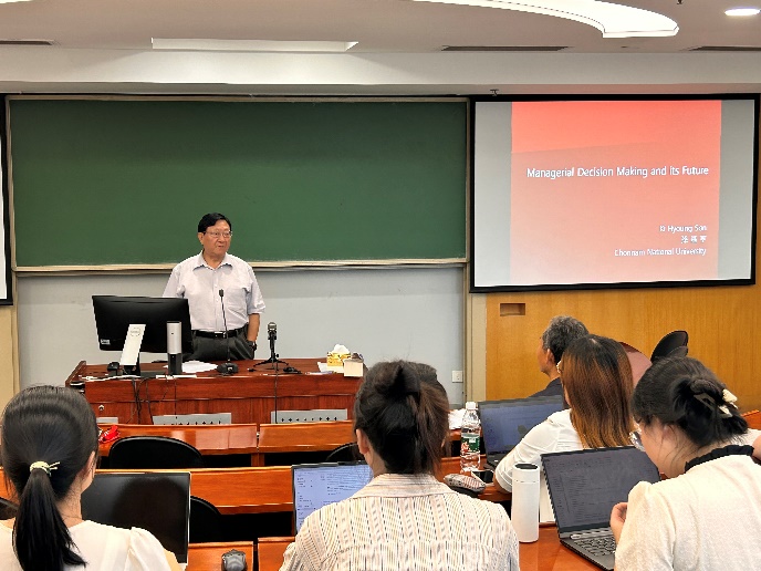 2023年9月4日下午,德鲁克论坛第133期在安中楼301教室顺利举行。韩国全南国立大学太阳成集团tyc33455cc孙基亨教授受邀作了题为“人工智能时代的管理决策及未来”的主题报告。论坛由太阳成集团tyc33455cc人文社科资深教授、太阳成集团tyc33455cc名誉经理、知行书院经理赵曙明教授主持。20余名教师、博士后和博士生参加了本次论坛。