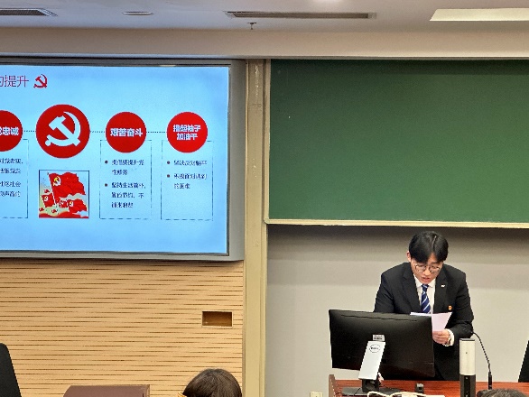大会最后,王宇伟进行总结点评。王宇伟首先肯定各位同志的精心准备与现场答辩表现。他表示,各位预备党员入党动机端正、理论学习积极,能主动关注时政新闻和社会热点问题,在学习、工作和生活等方面起到了表率作用。他同时希望,全体党员应以更高标准要求自己,坚持学思用贯通、知信行统一,锤炼政治品格,增强党性修养。一方面,要认真学习党章,严格遵守党章、贯彻党章、维护党章,不折不扣把党章各项要求落实到行动上、体现在学习和工作中;另一方面,支部要把党员发展工作作为重点内容和重要抓手,严格落实“三会一课”制度,不断推进基层党组织标准化规范化建设,坚持政治标准,严把党员发展质量关。王宇伟寄语青年党员,不忘初心,牢记使命,锐意进取,挺膺担当,发挥旗帜引领作用,争做时代的弄潮儿。