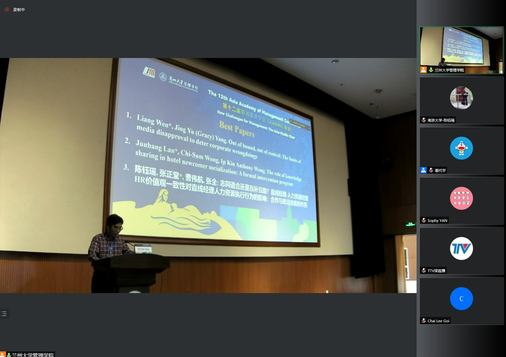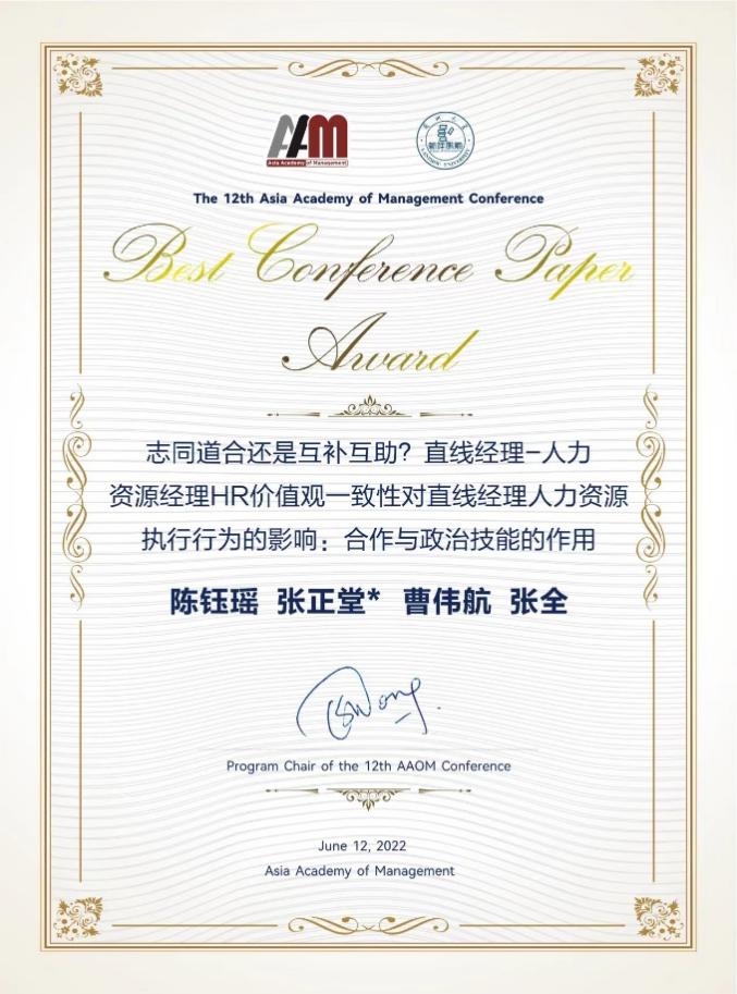 2022年6月11日-13日,第十二届亚洲管理学会(英文:Asia Academy of Management,简称AAOM)年会以“线上+线下”的形式在兰州大学召开。公司工商管理(人力资源管理方向)2019级博士生陈钰瑶、2020级博士生曹伟航、张全与导师张正堂教授合作完成的论文“志同道合还是互补互助?直线经理-人力资源经理HR价值观一致性对直线经理人力资源执行行为的影响:合作与政治技能的作用”荣获本届年会最佳论文奖(Best Conference Paper Award)。据悉,本届会议共收到论文投稿175篇,评选出3篇优秀论文。