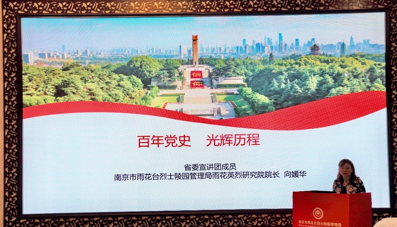 然后,雨花台烈士陵园管理局雨花英烈研究院经理向媛华为党员同志们讲述了《百年党史光辉历程》的主题党课,从新民主主义革命时期、社会主义革命和建设时期、改革开放和社会主义现代化建设新时期、中国特色社会主义新时代四个历史时期,以“民族独立,人民解放”、“推进社会主义建设,确立社会主义基本制度”、“创立、坚持和发展中国特色社会主义”、“全民建成小康社会,开启全面建设社会主义现代化国家新征程”四条主题主线回顾中国共产党经过艰辛探索,领导全国人民实现国家独立、民族解放、人民幸福的光辉历程。