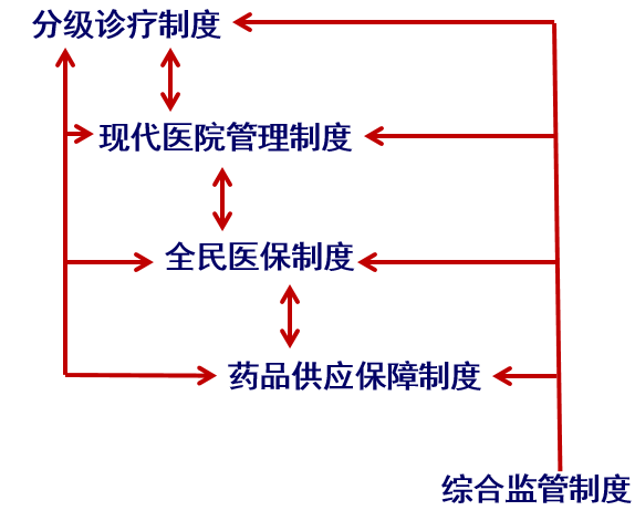 从五项基本医疗卫生制度分别来看:一、分级诊疗制度的“硬骨头”在于基层能力建设、公立医院改革、医保支撑及法制保障;二、现代医院管理制度在于解决“九龙治水”、管办分开及法人治理结构等问题;三、全民医保制度在于加快管理体制和支付方式改革;四、药品供应保障制度在于建立药品价格体系和压缩流通环节;五、综合监管制度在于落实政府部门综合监管、第三方监管和社会监督。