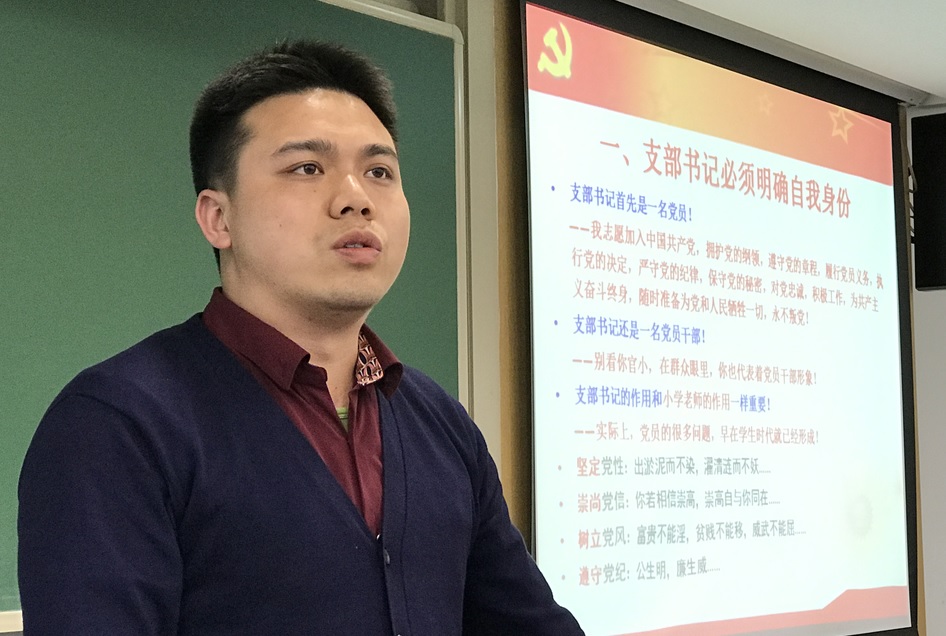 第二部分,原经济博士第二党支部书记何飞同学结合自身经历分享了“如何做好一名党支部书记”的工作感悟。何飞同学说,党支部书记必须要明确党员与党员干部的双重身份,应当做到紧密联系党外群众、党内同志、支部委员和上级组织“四个联系”,要做在思想、学习、工作、生活方面做到“四个表率”,还要夯实“看、听、学、备、讲、写”的基本功。随后,何飞同学结合当下大热的电视剧《人民的名义》介绍如何利用好影视、文件、微信、网络等各类资源开展支部的学习活动,并重点讲授了支部书记该如何讲好党课。最后何飞同学结合自身工作经历勉励大家用做科研的态度作支书,并对如何促进培养优秀的党支部书记提出具体建议。何飞同学的讲解生动,案例翔实,赢得了全场热烈的掌声。