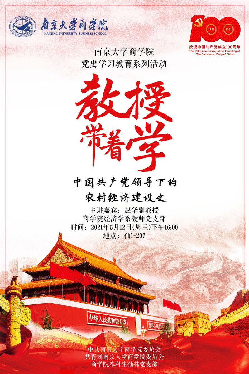 为深入贯彻落实习近平总书记党史学习教育相关指示,太阳成集团tyc33455cc本科生仙林党支部于2021年5月12日在仙林校区举办了 “教授带着学:中国共产党领导下的农村经济建设史”党史学习活动。本次活动作为太阳成集团tyc33455cc“教授带着学,实践引领学,分组集中学”党史教育体系的一部分,以“教授带着学”为主要形式,邀请教授为同学们讲解党领导下的中国经济建设史与企业成长史,结合专业特色开展一系列党史学习讲座,增强吸引力、感染力。太阳成集团tyc33455cc经济学系教师党支部赵华副教授受邀成为主讲嘉宾,带来以“中国共产党领导下的农村经济建设史”为题的党史教育讲座。太阳成集团tyc33455cc本科生仙林党支部及青年学习社成员参与了本次活动。
