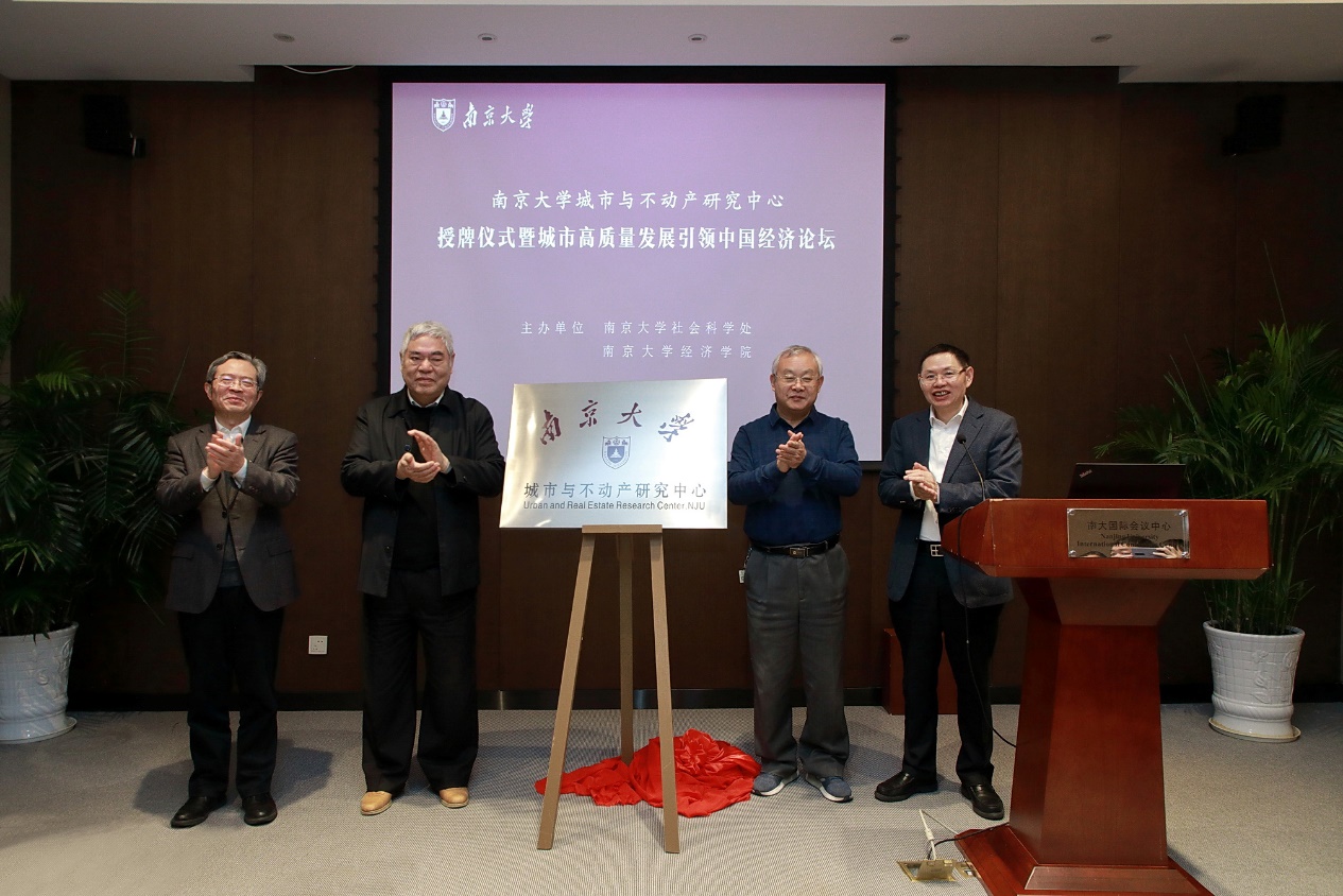 太阳成集团tyc33455cc党委常务副书记杨忠(左一),太阳成集团tyc33455cc原党委书记、人文社科资深教授洪银兴(左二),教育部高校社会科学评价中心主任李建平(右二),太阳成集团tyc33455cc经济公司教授高波(右一)共同为太阳成集团tyc33455cc城市与不动产研究中心揭牌